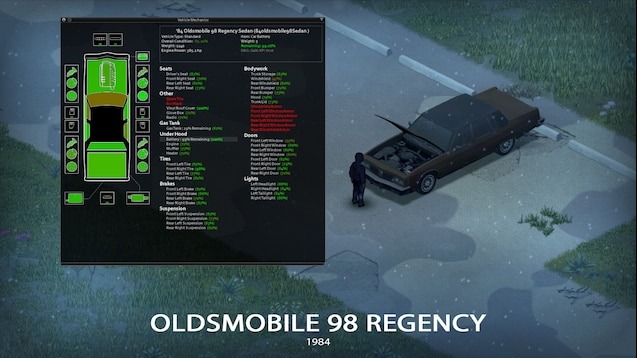 Мод добавляет в Project Zomboid культовый американский седан 1984 года — Oldsmobile 98 Regency. Этот автомобиль представляет собой настоящую «земельную яхту» 80-х: большой, с плавной ездой и яркой ретро-стилистикой. Идеально подходит для исследования апокалиптического мира, перевозки выживших или просто для стильного передвижения по открытому миру. Автомобиль совместим с рядом стандартных и уникальных деталей, что позволяет кастомизировать его под свой стиль и тактические нужды.