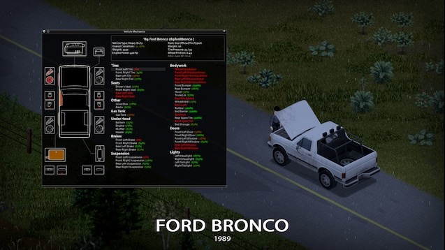 Мод ’89 Ford Bronco превращает классический внедорожник в полноценного спутника выжившего — мощного, защищённого и практичного. Отличный выбор для тех, кто ценит надёжность, эстетику ретро и продуманную механику в Project Zomboid.