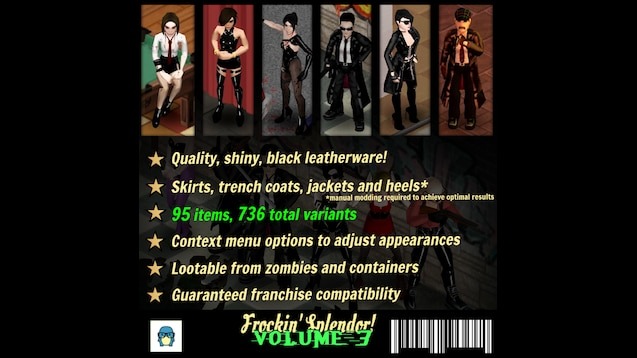 Мод Frockin Splendor! Vol.3 для Project Zomboid — это масштабное дополнение одежды из блестящей чёрной кожи, полностью переработанное и расширенное для версии B42. Автор не просто перенёс контент, а заново пересобрал его с использованием новых технологий, углублённой кастомизации и улучшенного визуального качества, заложив основу для дальнейших частей проекта.