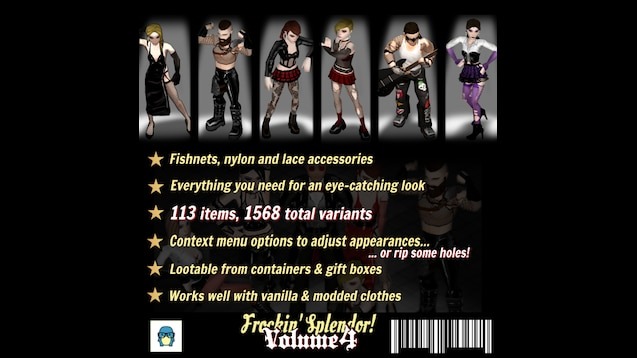Frockin Splendor! Vol.4 — это масштабное дополнение одежды для Project Zomboid, ориентированное на мрачную эстетику готики, панка и провокационных образов, выполненное с высоким уровнем детализации и полностью адаптированное под Build 42. Мод завершает основную линейку серии, расширяя гардероб персонажа сотнями вариаций одежды и добавляя новые игровые механики, связанные с тканями и кастомизацией внешнего вида.