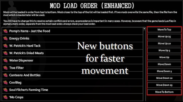 Mod Manager: Enhanced Load Order — это вспомогательный мод для Project Zomboid, который расширяет возможности стандартного Mod Manager и делает управление порядком загрузки модов значительно удобнее, особенно при работе с большими списками. Основная цель мода — сократить количество лишних действий и кликов при сортировке, сохранив при этом полную совместимость с существующей системой модификаций.