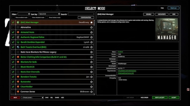 Mod Manager предоставляет игрокам простой и удобный способ управления модами в игре Project Zomboid. Установка, обновление, отключение и удаление модов становятся легкими и быстрыми процессами. Необходимые модификации могут быть выбраны и настроены с помощью интуитивного интерфейса. Воспользуйтесь Mod Manager, чтобы полностью настроить свой игровой опыт и создать идеальную комбинацию модов для Project Zomboid.