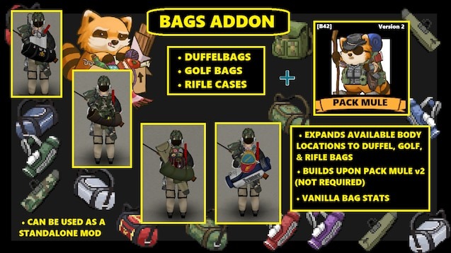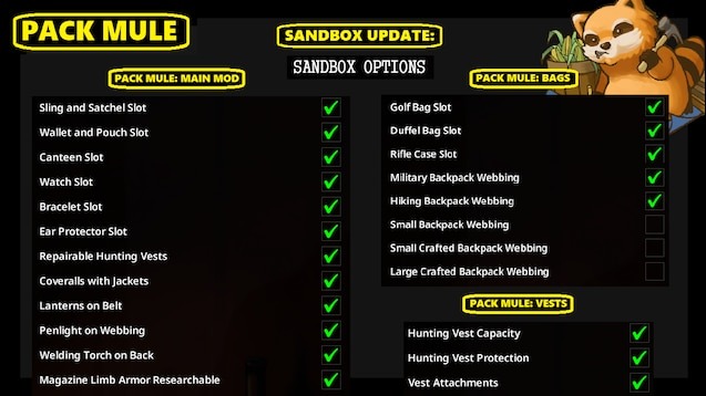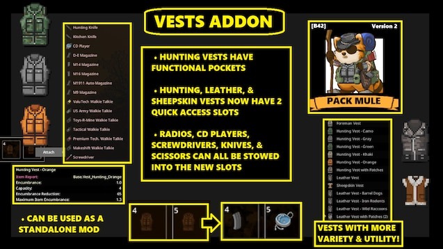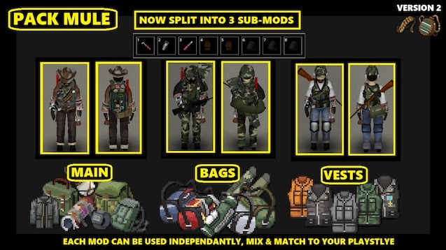 Благодаря модульности и новым настройкам в Песочнице, Pack Mule v2 позволяет игроку полностью настроить систему переноски и хранения предметов. Все функции снабжены всплывающими подсказками для удобства. Внимание: при переходе с оригинального Pack Mule рекомендуется сделать резервную копию сохранения, так как возможна потеря предметов (особенно в охотничьих жилетах); для минимизации риска рекомендуется сначала активировать подмод «Жилеты».