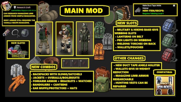 - Добавляет разгрузочные стропы (Webbing) на рюкзаки: военный, походный и различные крафтовые рюкзаки (малый и большой), а также малый рюкзак (последние три отключены по умолчанию).