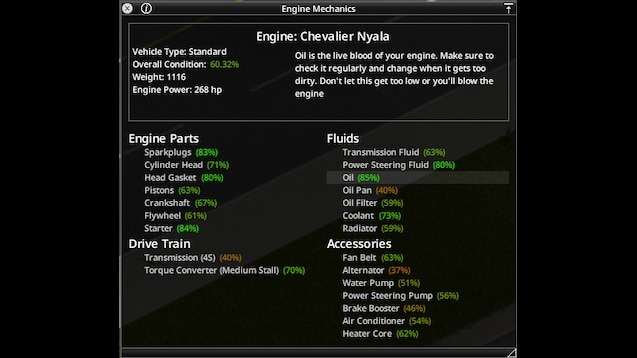 Мод Project Summer Car превращает механику автомобилей в Project Zomboid в полноценную техническую симуляцию. Теперь двигатель состоит из 18 типов деталей и 4 видов жидкостей, каждая из которых влияет на производительность. Ухудшение состояния свечей, поршней, радиатора или даже масляного фильтра напрямую сказывается на мощности, расходе топлива и риске перегрева. Мод интегрируется с Realistic Car Physics, обеспечивая глубокую физику управления, а также совместим с модами от KI5, Filibuster Rhymes, Autostar и другими.
