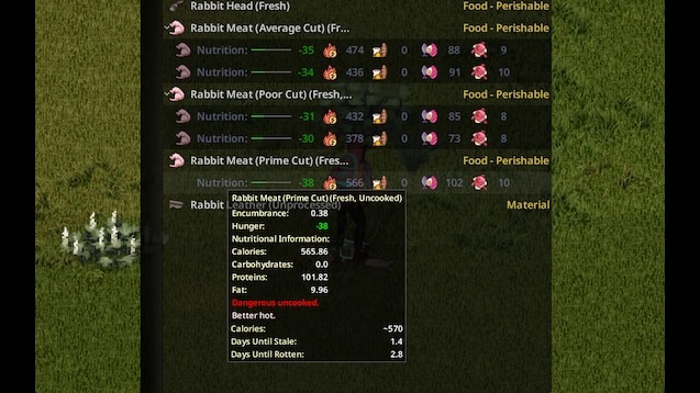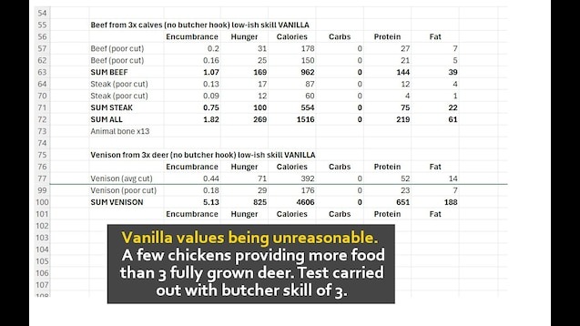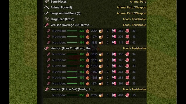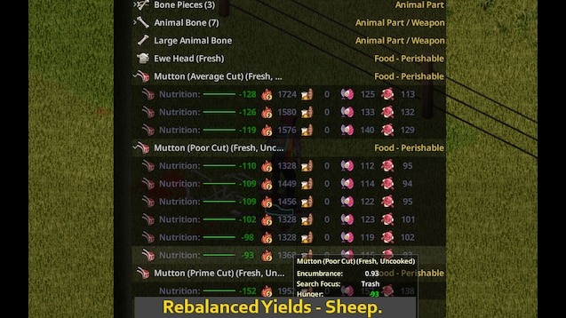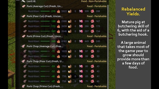 - Не добавляет новых предметов, корректирует калории, белки и жиры существующих мясных предметов до более реалистичных значений через скрипты Lua.