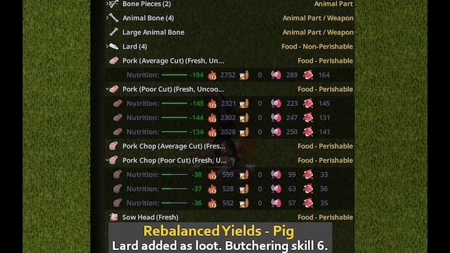 Rebalanced Yields: Butchering — это мод для Project Zomboid, который перерабатывает механику разделки животных, делая её более реалистичной и сбалансированной для игрового процесса. Он исправляет недоработки ванильной игры, когда крупные животные давали слишком мало мяса, а мелкие — генерировали ненужные мелкие куски. Мод ориентирован на сохранение погружения, улучшая качество добычи, не нарушая базовые значения мясных предметов, и делает процесс разделки более логичным и полезным для выживания.