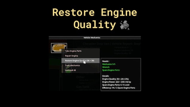- Процесс: Каждое восстановление потребляет детали двигателя и повышает качество в зависимости от вашего навыка.