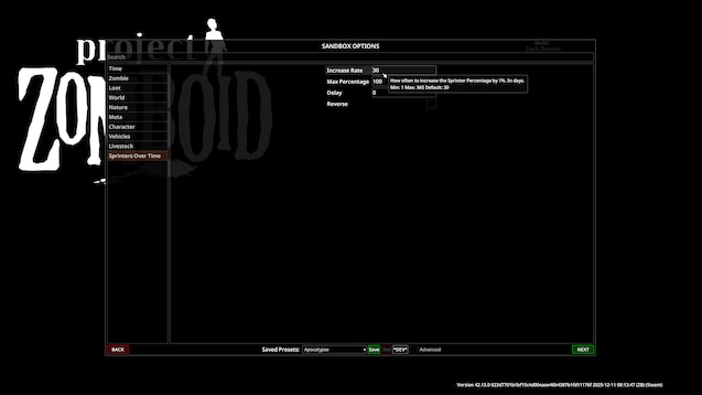 - Постепенное увеличение спринтеров — по умолчанию процент быстрых зомби увеличивается на 1% каждый месяц (учитывая настройку «Месяцы после апокалипсиса»).