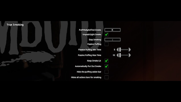 Мод True Smoking превращает курение в полноценную механику, которая разворачивается во времени и влияет на состояние персонажа. Вместо мгновенного действия теперь есть динамический процесс с постепенным воздействием никотина, расслаблением и побочными эффектами. Мод также добавляет опциональную систему зависимости, которая делает привычку курильщика более естественной и приближённой к реальности.