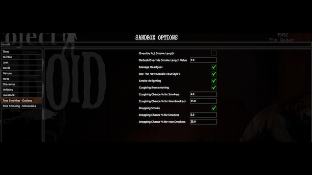 True Smoking делает процесс курения в Project Zomboid глубоким, гибким и естественным. Мод подойдёт как для реалистов, так и для тех, кто хочет добавить атмосферности в игровой процесс. Всё можно настроить под себя — от автоматических затяжек до уровня никотиновой зависимости, создавая максимально аутентичный опыт выживания.