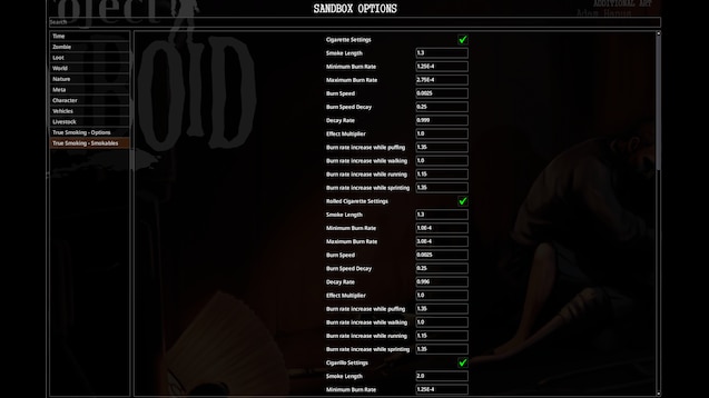 - Все параметры (время горения, сила эффекта, частота затяжек) регулируются в Sandbox Options и Mod Options.