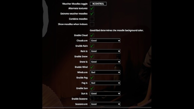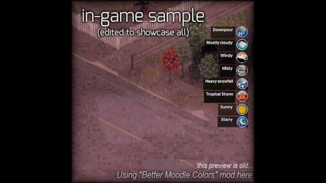 Мод добавляет на экран набор визуальных мудлов, которые отображают текущее состояние погоды в Project Zomboid. Он не меняет механику выживания, а служит наглядным способом понять, что происходит в небе — от облаков и ветра до гроз и смены сезонов.